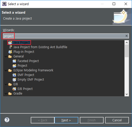 'project' 를 입력하고 Java Project 선택
