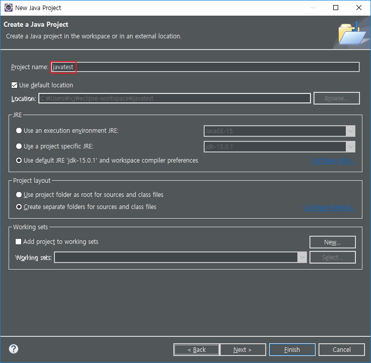 Project name 을 설정하고 사용할 JRE 선택 Finish를 누릅니다. (모르겠다면 기본값)