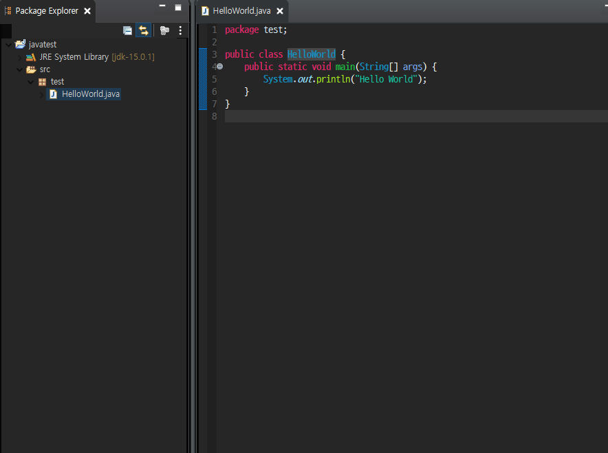 Package Explorer 에서 방금 만든 프로젝트를 확인할 수 있습니다.