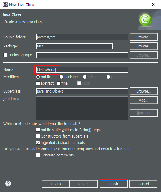 클래스 파일명을 입력한 뒤 Finish