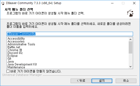 시작 메뉴 아이콘 만들지 않으려면 체크 후 설치