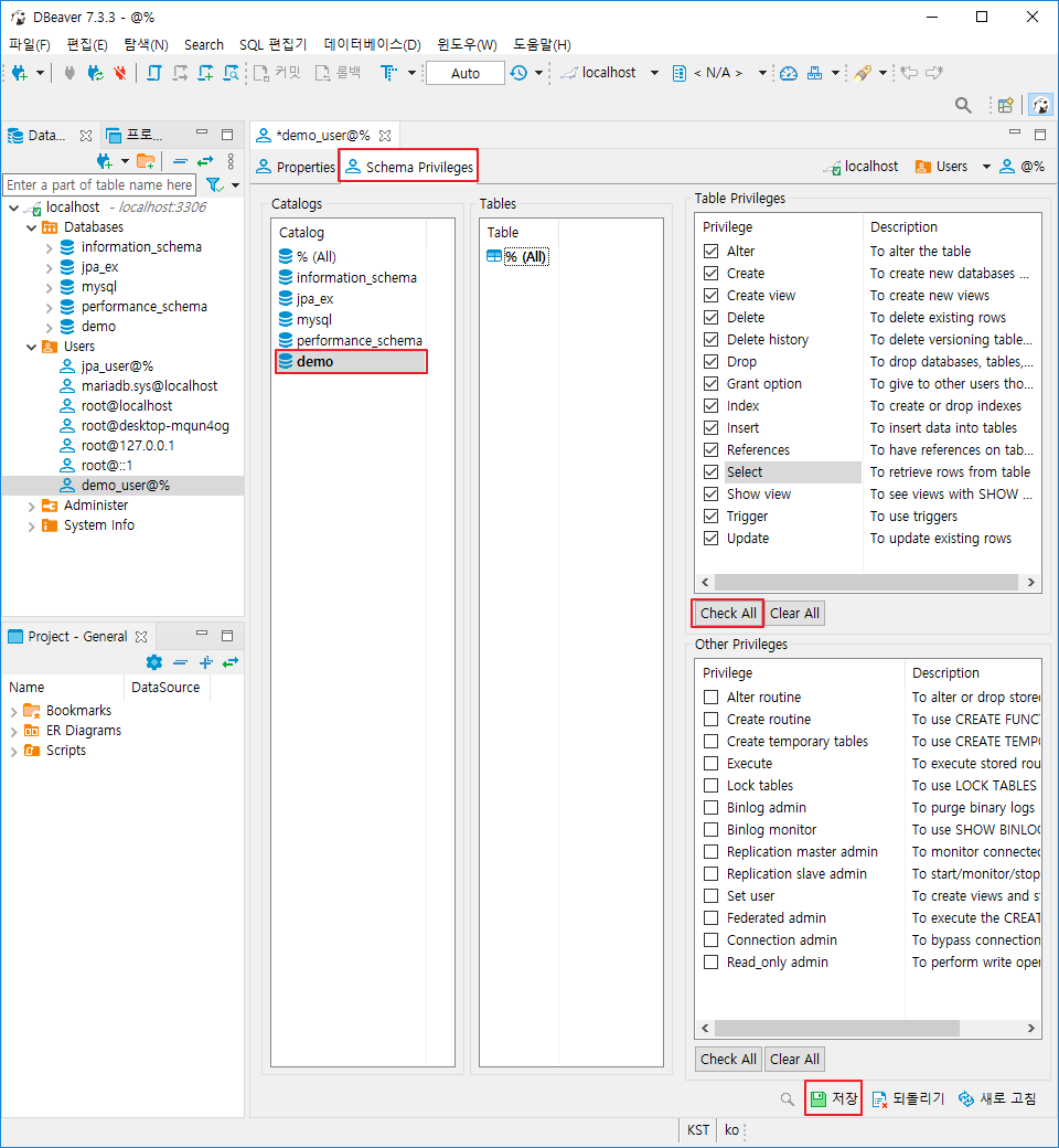 Table Privileges - Check All - 저장