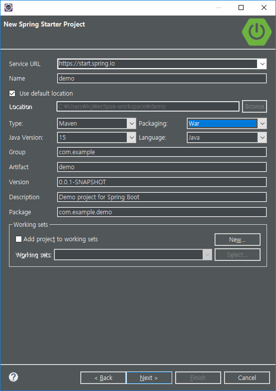 - Package: 초기 소스들이 만들어질 기본 패키지명