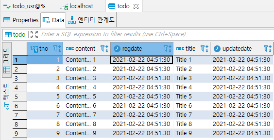 package com.td.domain; import java.sql.Timestamp; import javax.persistence.Entity; import javax.persistence.GeneratedValue; import javax.persistence.GenerationType; import javax.persistence.Id; import javax.persistence.Table; import org.hibernate.annotations.CreationTimestamp; import org.hibernate.annotations.UpdateTimestamp; import lombok.Data; @Data @Entity @Table public class Todo { @Id @GeneratedValue(strategy = GenerationType.IDENTITY) private Long tno; private String title; private String content; @CreationTimestamp private Timestamp regdate; // LocalDateTime @UpdateTimestamp private Timestamp updatedate; // LocalDateTime }src/main/java/com/td/repository/TodoRepository.java