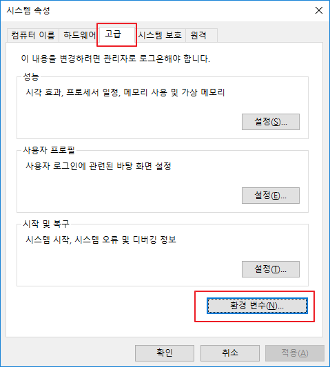 - 고급 탭 - 환경 변수