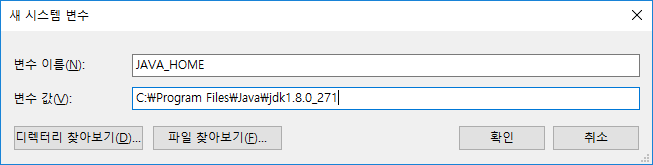 - 변수 값 : C:\Program Files\Java\jdk1.8.0_271 (아까 복사했던 jdk 설치 경로)