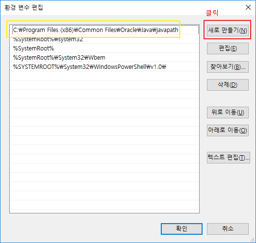- 요즘에는 기본으로 Path가 잡혀져 있습니다. 하지만 해당 경로에는 java, javaw, javaws만 존재하기 때문에 별개로 새로 만들기를 클릭해 줍니다.