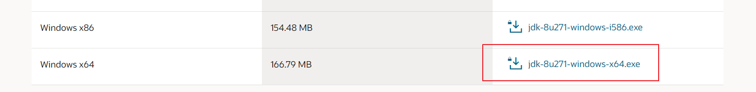 스크롤을 내려 'jdk-8u271-windows-x64.exe' 선택