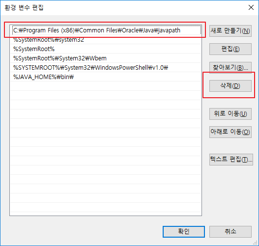 시스템변수 - Path -편집 - Oracle Javapath 삭제