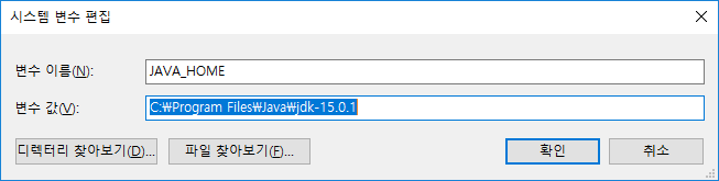 시스템변수 - JAVA_HOME - 편집 - JDK15 디렉토리로 값 수정