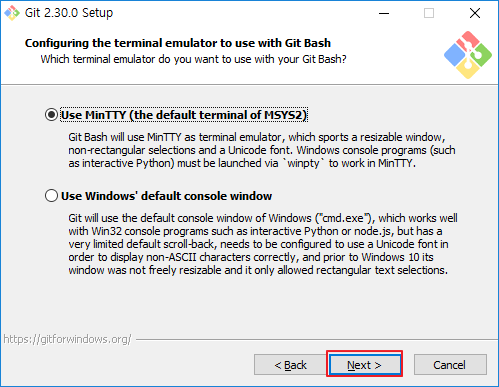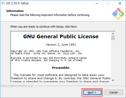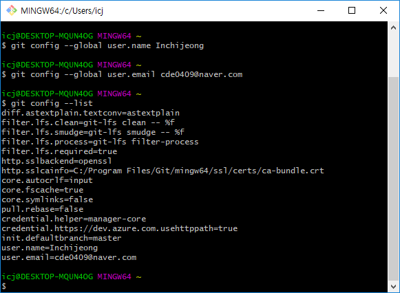 - 설치 이후 실행된 Git Bash에서 다음 명령어 입력