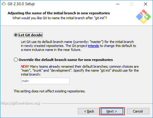 - Next (기본 브랜치명을 설정하고 싶다면 두번째 클릭)