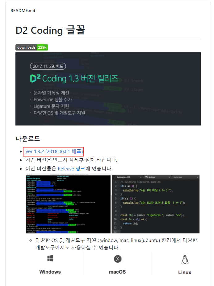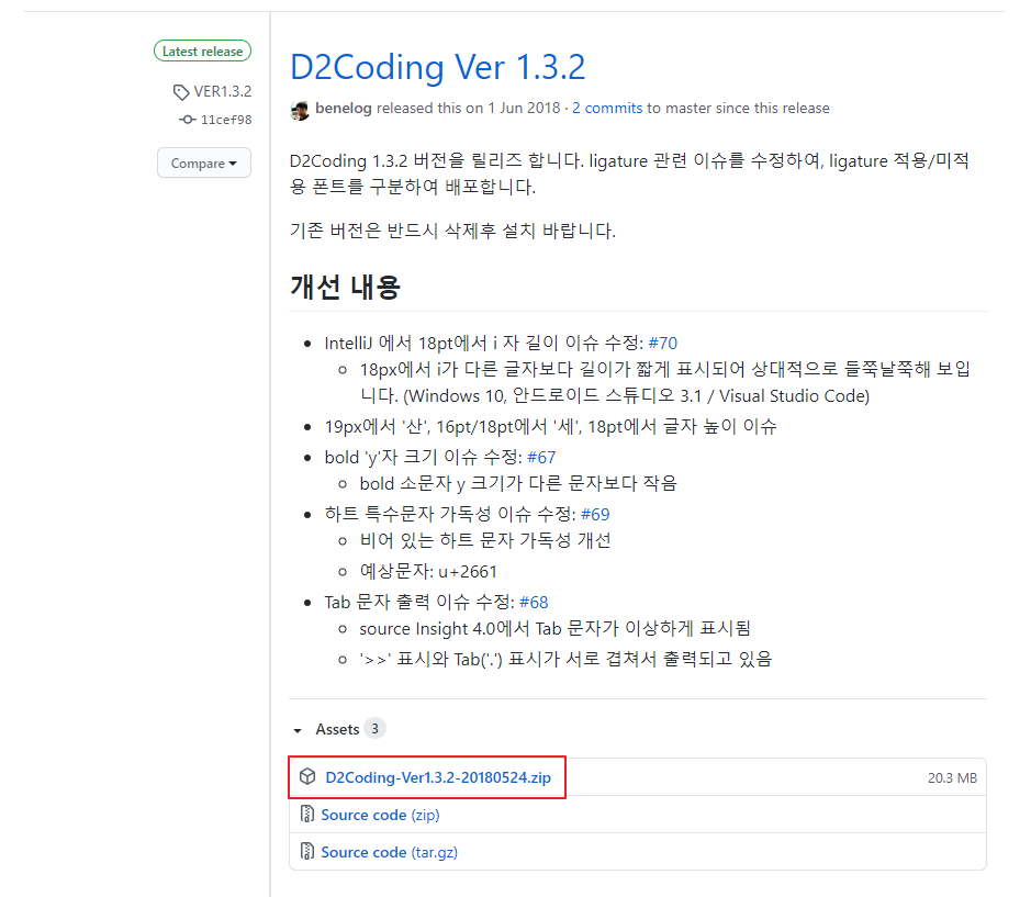 D2Coding-Ver1.3.2-20180524.zip 클릭해서 설치 파일 받기