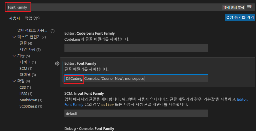 글꼴 패밀리 맨 앞에 D2Coding 추가