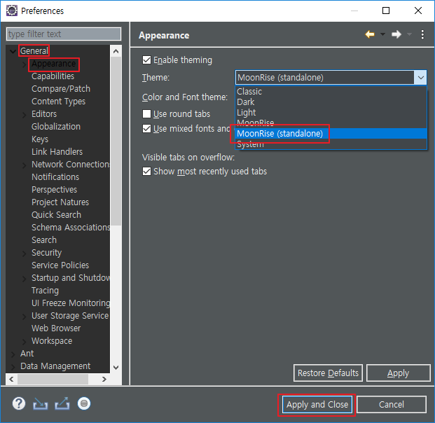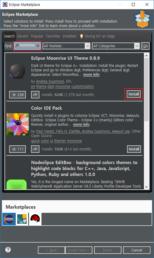 Eclipse Moonrise UI Theme 의 Install 클릭