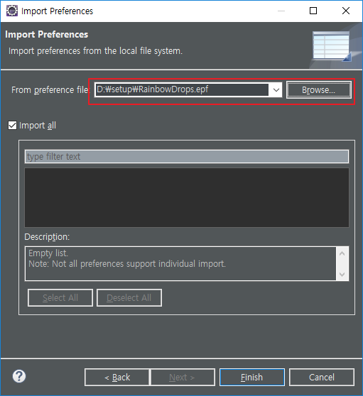 - 아까 다운받은 theme-24587 (혹은 RainbowDrops.epf) 불러오기 후 Finish