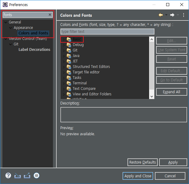 상단 메뉴의 Window - Preferences